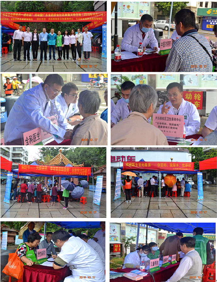 各活動點均由廣東省藥學(xué)會社區(qū)聯(lián)盟成員單位的各中心主任親自帶隊,組織所在單位的醫(yī)師(含家庭醫(yī)生)、藥師(含家庭藥師)、健康管理師等共同參與,部分活動點還邀請了中山大學(xué)孫逸仙紀(jì)念醫(yī)院、廣州醫(yī)科大學(xué)附屬第三醫(yī)院等三甲醫(yī)院專家參加,為所在社區(qū)居民提供安全用藥科普咨詢及指導(dǎo)?;顒觾?nèi)容豐富多彩,包括免費量血壓、測血糖、測血脂、測尿酸、艾灸、貼耳穴、推拿,以及安全用藥咨詢和派發(fā)安全用藥知識小冊子、小禮品等。有些義診點還制作了“安全用藥一起行動”視頻宣傳片現(xiàn)場播放并供市民下載學(xué)習(xí),將有關(guān)安全用藥、正確服藥方法、家庭藥品儲存、看好藥品說明書等常識內(nèi)容巧妙加入片中,讓居民更加容易接受和學(xué)習(xí)。有些活動點著重宣傳家庭小藥箱常備藥品的選擇、購買、服用的注意事項以及不同人群該如何正確服藥、服錯藥后的家庭急救辦法等。有的還同時開展了家庭醫(yī)生簽約服務(wù)。