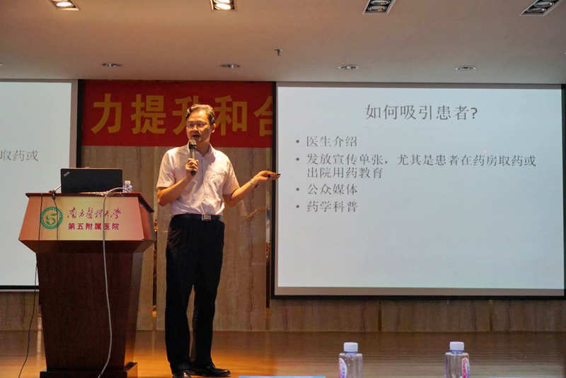 鄭志華秘書(shū)長(zhǎng)、劉世霆主任、陳吉生主任、邱凱鋒副主任分別為學(xué)員們講解了《藥學(xué)門(mén)診如何開(kāi)展》、《新醫(yī)改背景下藥師定位的思考》、《仿制藥一致性評(píng)價(jià)政策的思考》、《藥師能力模型解讀》,從不同角度闡述了藥師服務(wù)轉(zhuǎn)型的重要性。南方醫(yī)科大學(xué)第五附屬醫(yī)院陳剛主任、郭建平主任、王鵬主任分別從胸痛中心ACS患者的藥物管理、糖尿病慢病管理與合理用藥、抗菌藥物醫(yī)院系統(tǒng)管理等方面向?qū)W員分享如何加強(qiáng)臨床合理用藥。最后,黃彩玲組長(zhǎng)與大家分享PIVAS高分通過(guò)評(píng)審的經(jīng)驗(yàn)。