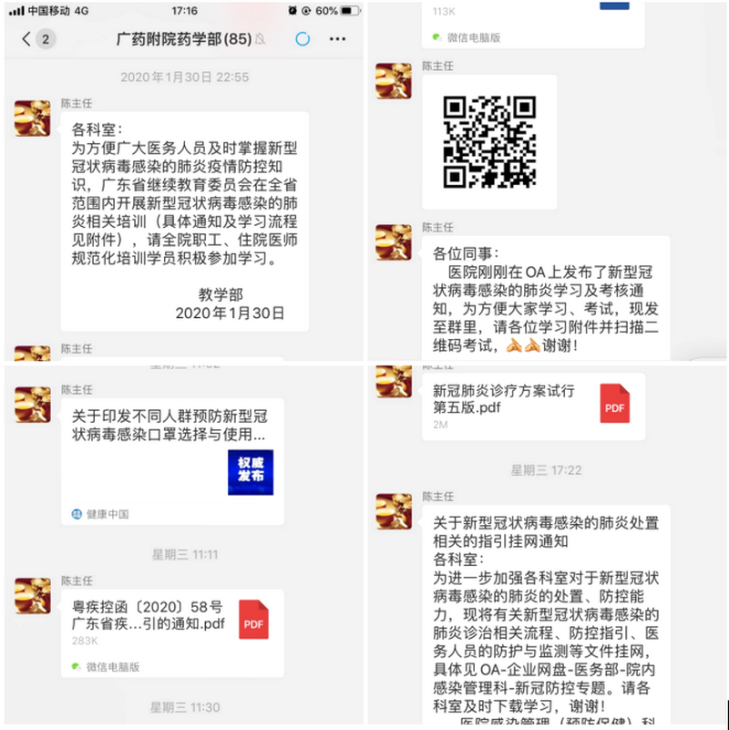 陳吉生主任時(shí)刻根據(jù)國(guó)家、省委、院黨委各項(xiàng)決策部署,組織全科室人員學(xué)習(xí)新型冠狀病毒肺炎防控相關(guān)培訓(xùn)。利用微信群組織科室全體人員學(xué)習(xí)《新型冠狀病毒肺炎相關(guān)培訓(xùn)》、《新型冠狀病毒感染的肺炎醫(yī)務(wù)人員防控》、《新型冠狀病毒感染的肺炎口罩使用指引》及各版本《新型冠狀病毒感染的肺炎診療方案(試行)》等,并進(jìn)行相關(guān)考核。
