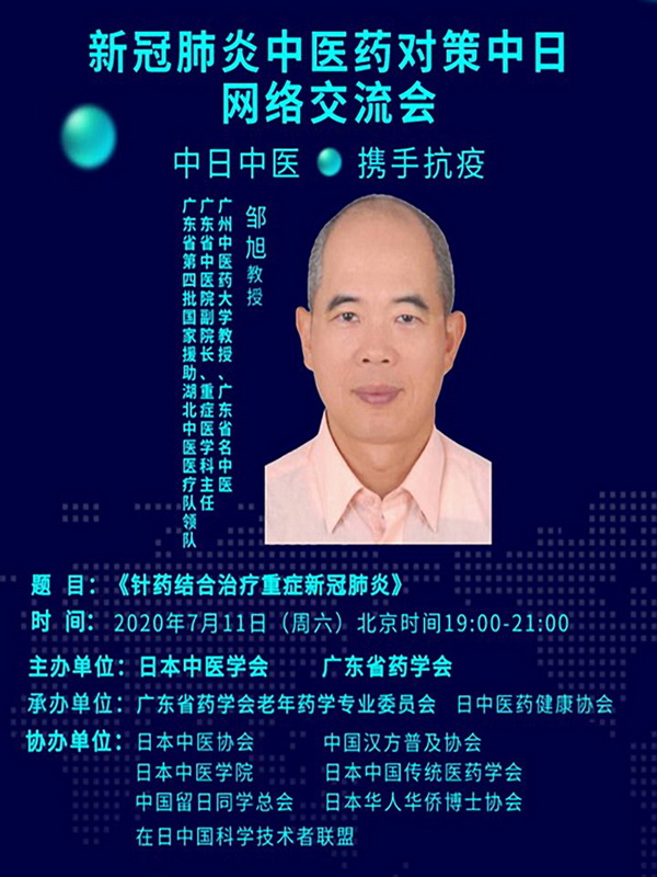 2020年7月11日北京時(shí)間19:00-21:30、東京時(shí)間(20:00-22:30),由本會(huì)與日本中醫(yī)學(xué)會(huì)共同主辦,廣東省藥學(xué)會(huì)老年藥學(xué)專(zhuān)業(yè)委員會(huì)、日中醫(yī)藥健康協(xié)會(huì)共同承辦的“新冠肺炎中醫(yī)藥對(duì)策中日網(wǎng)絡(luò)交流會(huì)”成功舉辦。會(huì)議由暨南大學(xué)藥學(xué)院聶紅教授主持,日中醫(yī)藥健康協(xié)會(huì)馬驥副會(huì)長(zhǎng)作大會(huì)翻譯。據(jù)悉,這是日本中醫(yī)學(xué)會(huì)與我國(guó)有關(guān)單位共同舉辦的第七次應(yīng)對(duì)新冠肺炎相關(guān)網(wǎng)絡(luò)學(xué)術(shù)交流活動(dòng)。