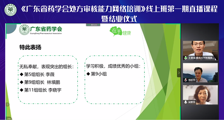 接下來(lái),大家通過(guò)視頻回顧了《廣東省藥學(xué)會(huì)處方審核能力網(wǎng)絡(luò)培訓(xùn)》線上一期班在學(xué)習(xí)過(guò)程中的精彩瞬間;觀看了一期班的專家講師團(tuán)隊(duì)對(duì)學(xué)員們的寄語(yǔ)和祝福。在結(jié)業(yè)儀式直播現(xiàn)場(chǎng),吳新榮主任宣讀了總成績(jī)排在前十名的優(yōu)秀學(xué)員名單,對(duì)無(wú)私奉獻(xiàn)、表現(xiàn)突出的組長(zhǎng)和學(xué)習(xí)積極、成績(jī)優(yōu)秀的小組進(jìn)行重點(diǎn)表?yè)P(yáng),并對(duì)他們表示祝賀!