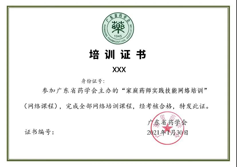 通過培訓考核您將獲得廣東省藥學會頒發(fā)的培訓證書(電子證書,電子證書以實物為準)。
