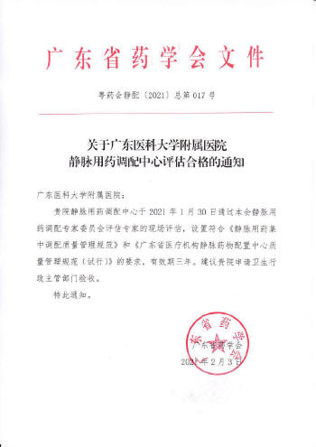 2021年2月3日廣東省藥學(xué)會正式文件通知:廣東醫(yī)科大學(xué)附屬醫(yī)院靜脈用藥調(diào)配中心評估合格!