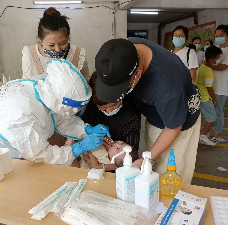 2、6月4日,陳濼(中共黨員)在廣州市番禺區(qū)南村鎮(zhèn)廣地花園,參與社區(qū)人群新冠核酸篩查采樣工作。