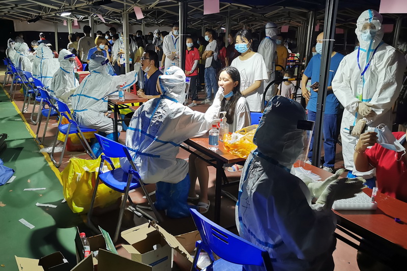 廣州的夏夜依然悶熱,加上密不透風(fēng)的防護服,不一會就汗流浹背,身體感覺可想而知。但一旦全情投入工作,便已忘卻了身上的汗水,大家只有一個信念:盡最大的能力、盡最快的時間完成核酸采樣任務(wù)。