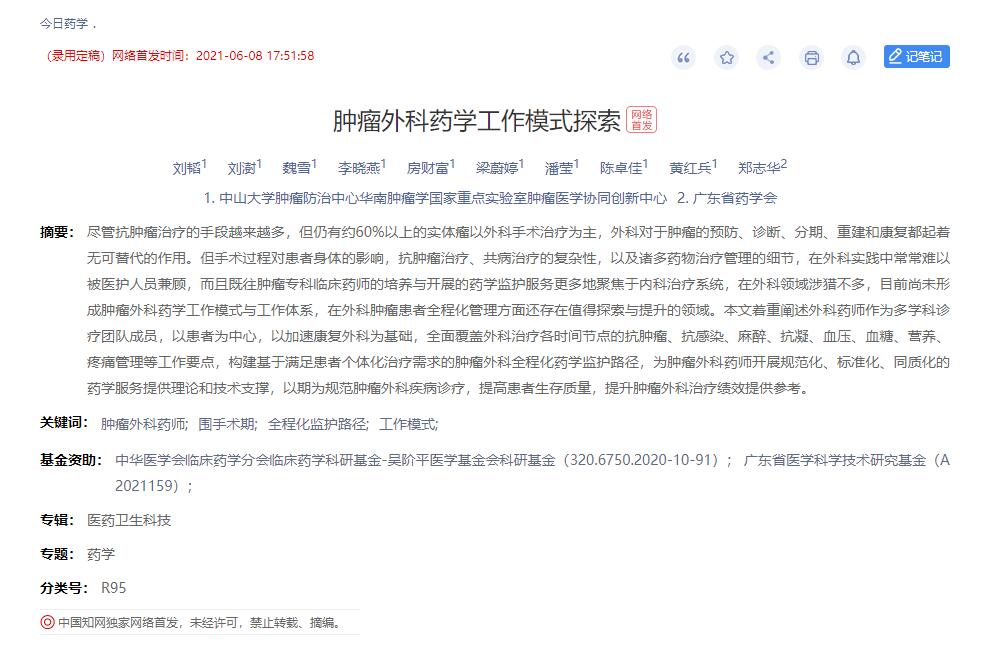 外科藥學(xué)??苹剿鳌赌[瘤外科藥學(xué)工作模式探索》發(fā)表