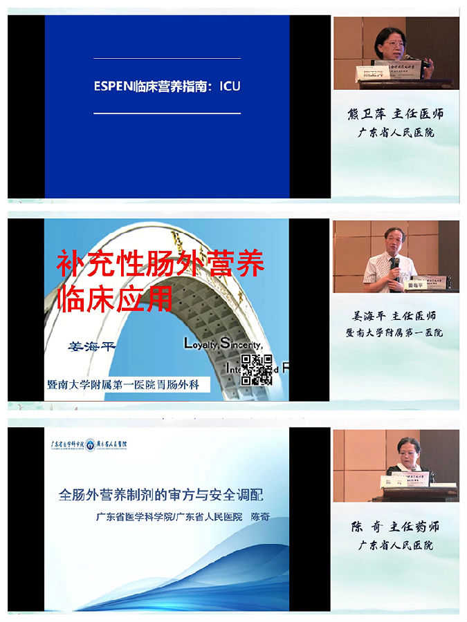 腸外營(yíng)養(yǎng)制劑專(zhuān)場(chǎng)由廣東省人民醫(yī)院熊衛(wèi)萍主任醫(yī)師、暨南大學(xué)附屬第一醫(yī)院姜海平主任醫(yī)師和廣東省人民醫(yī)院陳奇主任藥師授課,分別分享了《ESPEN臨床營(yíng)養(yǎng)指南:ICU》《補(bǔ)充性腸外營(yíng)養(yǎng)的臨床應(yīng)用》《全腸外營(yíng)養(yǎng)制劑的審方與安全調(diào)配》等內(nèi)容。