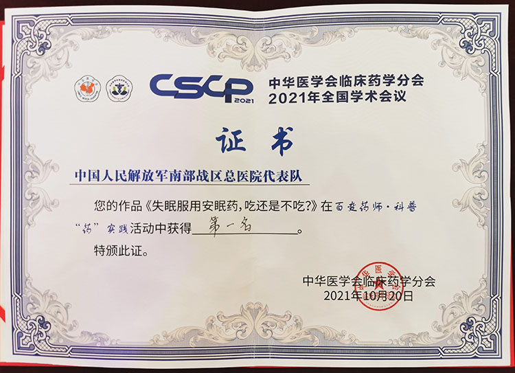 2021年10月20日,由廣東省醫(yī)學會臨床藥學分會選送的中國人民解放軍南部戰(zhàn)區(qū)總醫(yī)院(以下簡稱“南部戰(zhàn)區(qū)總醫(yī)院”)的藥學科普作品從全國487個參賽作品中層層晉級、與15支代表隊逐鹿中原,榮獲中華醫(yī)學會臨床藥學分會百變藥師?科普“藥”實踐藥學科普大賽一等獎。
