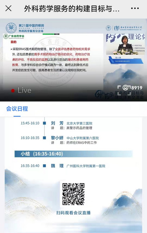 《外科藥學(xué)服務(wù)的構(gòu)建目標(biāo)與理論體系交流會(huì)》27日下午舉行。由中國(guó)藥學(xué)會(huì)科技開發(fā)中心和廣東省藥學(xué)會(huì)承辦、廣州醫(yī)藥股份有限公司支持。為確保論壇順利舉辦、提高交流效果,廣東省藥學(xué)會(huì)將廣東報(bào)告專家集中組織,進(jìn)行現(xiàn)場(chǎng)直播,外地專家線上直播。