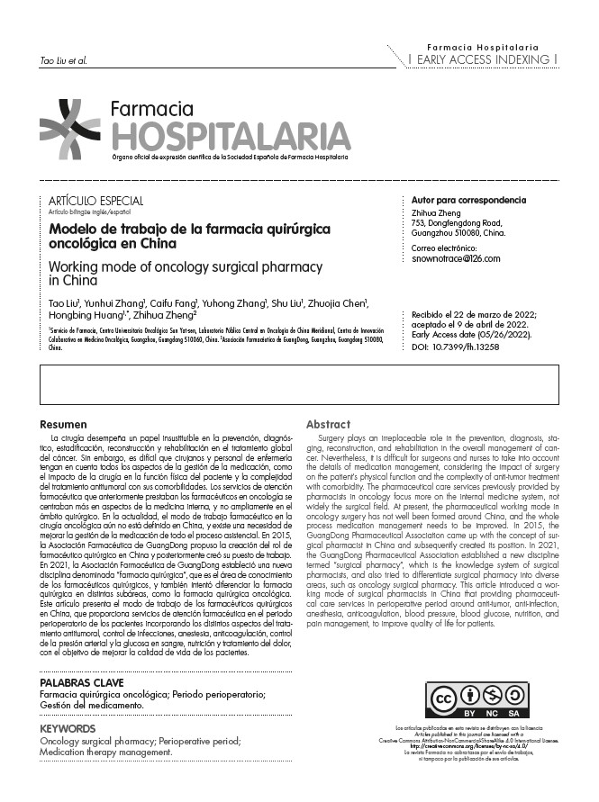 近日,廣東省藥學(xué)會(huì)(以下簡(jiǎn)稱“本會(huì)”)關(guān)于“外科藥學(xué)”的專論——“中國(guó)腫瘤外科藥學(xué)工作模式”一文,在西班牙Farmacia Hospitalaria(《醫(yī)院藥學(xué)》)雜志以西班牙文和英文同時(shí)發(fā)表,鏈接為http://revistafarmaciahospitalaria.sefh.es/gdcr/index.php/fh/article/view/13258,其西班牙文和英文PDF版均可在此鏈接下載。這篇專論是Farmacia Hospitalaria雜志通過國(guó)際藥學(xué)聯(lián)合會(huì)(International Pharmaceutical Federation,F(xiàn)IP)向本會(huì)約稿,由中山大學(xué)腫瘤防治中心劉韜主任團(tuán)隊(duì)撰寫,是本會(huì)第一篇以西班牙文發(fā)表的論文。