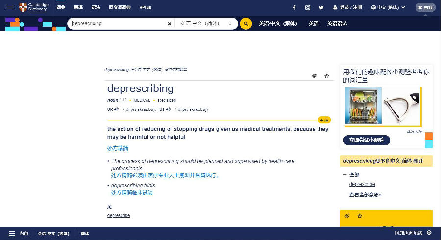 圖1 《劍橋詞典》(Cambridge Dictionary)收載“處方精簡(jiǎn)(deprescribing)”