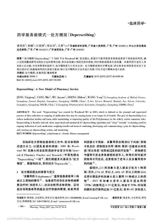 2017年3月22-24日,廣東省藥學(xué)會(huì)相關(guān)專家參加了在法國(guó)戛納召開(kāi)的2017年第22屆歐洲醫(yī)院藥劑師協(xié)會(huì)(EAHP)大會(huì)。來(lái)自加拿大的藥師Barbara Farrell在大會(huì)作了題為“風(fēng)險(xiǎn)中的老年人:安全地減少用藥以適應(yīng)生命的改變”的報(bào)告。報(bào)告中著重闡述了“deprescribing”這一概念,該詞指的是對(duì)可能導(dǎo)致患者損害或患者不再獲益的用藥,減少該藥劑量或停用該藥的計(jì)劃和管理過(guò)程;其目標(biāo)是減少用藥負(fù)擔(dān)和損害,同時(shí)維持或提高生活質(zhì)量。我們深刻意識(shí)到這是藥物治療管理(Medication Therapy Management, MTM)服務(wù)中的一項(xiàng)重要工作,而本會(huì)當(dāng)時(shí)正與美國(guó)藥師協(xié)會(huì)一起進(jìn)行MTM藥師的培訓(xùn)?;貒?guó)后,我們查閱了關(guān)于“deprescribing”的有關(guān)文獻(xiàn),因“deprescribing”沒(méi)有相應(yīng)的中文翻譯,我們根據(jù)該詞的內(nèi)涵和中文構(gòu)詞法,“de-”是表示“除去、向下”的前綴,“prescribe”是“開(kāi)處方”的意思,去“-e”加“-ing”是動(dòng)名詞,因此該單詞的意思是“在處方中減少、除去藥物”,“精簡(jiǎn)”的意思是“留下必要的,去掉不需要的”“精心挑選”,因此我們?cè)偃遄?,并根?jù)詩(shī)經(jīng)效應(yīng)的四字構(gòu)詞法,將其譯為“處方精簡(jiǎn)”,并就此撰寫了我國(guó)第一篇相關(guān)專論,發(fā)表在《今日藥學(xué)》雜志。
