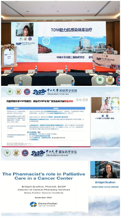 “抗感染藥學(xué)”分論壇。第一位講者來自哈佛Dana-Farber Cancer Institute的Bridget Scullion教授,她為大家?guī)砹藝馀R床藥師在緩和醫(yī)療中的作用思考和經(jīng)驗,從多個角度為我國緩和醫(yī)療臨床藥學(xué)的發(fā)展帶來了啟發(fā)和思路。中南大學(xué)湘雅二醫(yī)院徐萍主任介紹了TDM在抗感染治療領(lǐng)域的重要貢獻和相關(guān)的研究進展。中山大學(xué)附屬第三醫(yī)院張?zhí)焱兄魅螌⑾冗M的理論成果與豐富的經(jīng)驗巧妙結(jié)合,詳細解讀了β-內(nèi)酰胺酶抑制劑復(fù)方制劑相關(guān)的新共識。廣州醫(yī)科大學(xué)附屬第一醫(yī)院卓超主任分享了在耐藥及VBP背景下碳青霉烯抗菌藥物應(yīng)用的思考,強調(diào)對碳青霉烯規(guī)范應(yīng)用教育的重要性。廣州市第一人民醫(yī)院趙子文主任講解了常見下呼吸道感染疾病的臨床管理指南,為臨床提供新的選擇借鑒。中山大學(xué)附屬第一醫(yī)院曾嘉煒博士結(jié)合國內(nèi)外CRAB對抗菌藥的耐藥率數(shù)據(jù)及指南中CRAB治療基本原則與治療藥物等內(nèi)容,介紹了兒童CRAB的抗菌藥物治療進展。最后中山大學(xué)附屬第一醫(yī)院夏延哲臨床藥師分享了一例腎移植術(shù)后曲霉感染的病例,并由中山大學(xué)附屬第一醫(yī)院劉紫錳、傅茜、廖康、何秋毅,中山大學(xué)孫逸仙紀念醫(yī)院余曉霞,中山大學(xué)附屬第五醫(yī)院梁嘉碧等6位醫(yī)學(xué)、藥學(xué)、檢驗專家對該病例的侵襲性肺曲霉抗感染治療、混合細菌性肺炎抗感染治療以及治療方案調(diào)整等問題進行了熱烈討