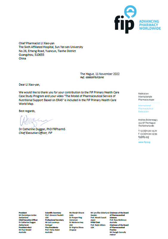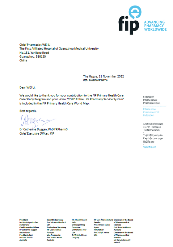 近日,廣東省藥學(xué)會推薦的“慢性阻塞性肺疾病(COPD)全生命周期藥學(xué)服務(wù)系統(tǒng)”( COPD Entire Life Pharmacy Service System)和“基于ERAS理念的營養(yǎng)支持藥學(xué)服務(wù)”( The Model of Pharmaceutical Service of Nutritional Support Based on ERAS),經(jīng)國際藥學(xué)聯(lián)合會遴選,入選“全球基本衛(wèi)生保健藥學(xué)經(jīng)典案例計(jì)劃”,在國際藥學(xué)聯(lián)合會官網(wǎng)以視頻方式分享給全球153個成員藥學(xué)同行。