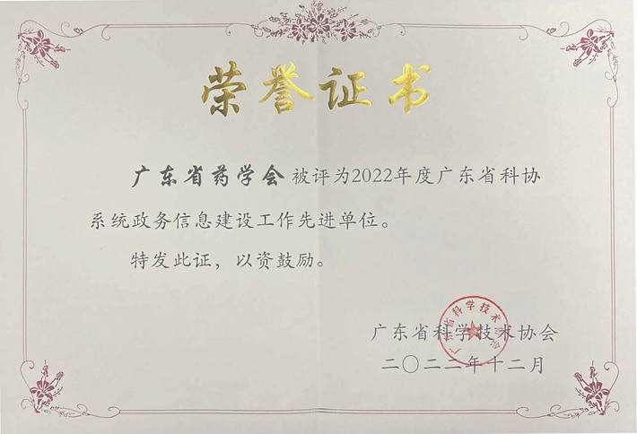 廣東省藥學(xué)會榮獲2022年度省科協(xié)系統(tǒng)政務(wù)信息建設(shè)工作先進單位