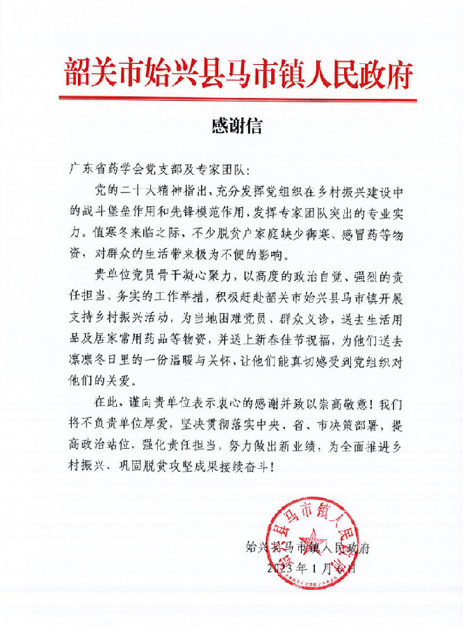 為認真貫徹落實黨的二十大精神,響應黨中央、國務院鄉(xiāng)村振興號召,充分發(fā)揮黨組織在鄉(xiāng)村振興建設中的戰(zhàn)斗堡壘作用和先鋒模范作用,發(fā)揮專家團隊突出的專業(yè)實力,將安全用藥、合理用藥知識送到基層,將黨和政府對廣大鄉(xiāng)村的關懷、關愛送到基層,2023年1月6日,新年伊始,廣東省藥學會黨支部會同粵北人民醫(yī)院門診第三黨支部、廣州國盈醫(yī)藥有限公司黨總支、阿斯利康廣州黨支部一道,前往粵北始興縣馬市鎮(zhèn),開展“送醫(yī)送藥進鄉(xiāng)村?真情幫扶暖民心”主題黨日活動。