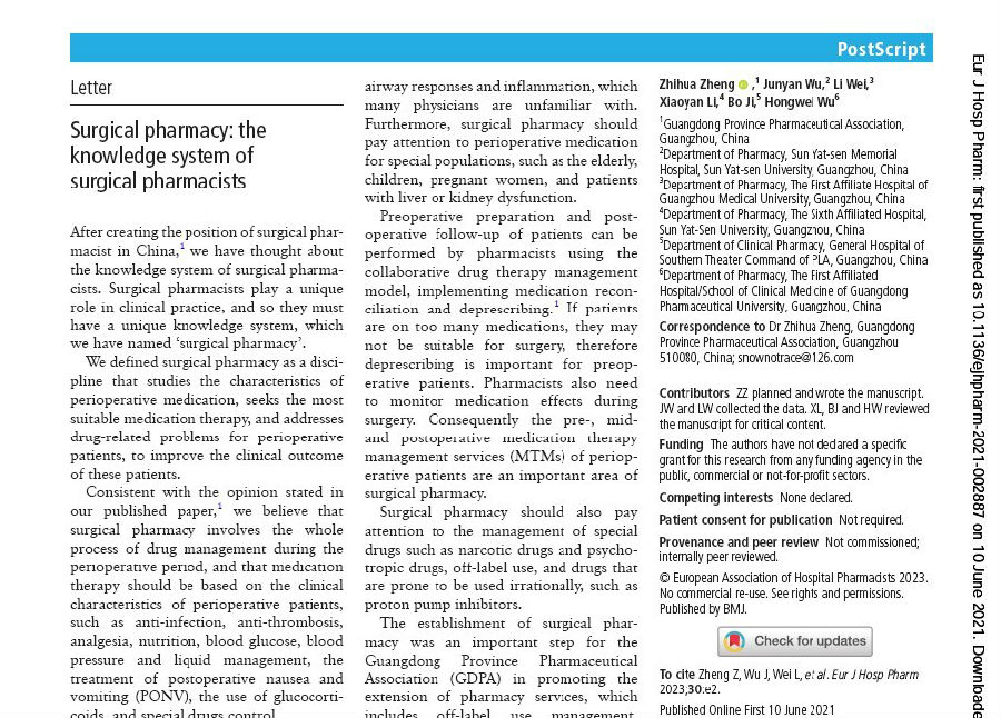 2021年6月,本會(huì)在BMJ系列期刊——《歐洲醫(yī)院藥學(xué)雜志》(European Journal of Hospital Pharmacy)發(fā)表了“外科藥師的知識(shí)體系——外科藥學(xué)(Surgical Pharmacy)”一文,介紹了“外科藥學(xué)”產(chǎn)生的背景、定義、學(xué)科框架、特點(diǎn)、意義等內(nèi)容。一些國(guó)外藥師來信進(jìn)行了相關(guān)問題的討論。