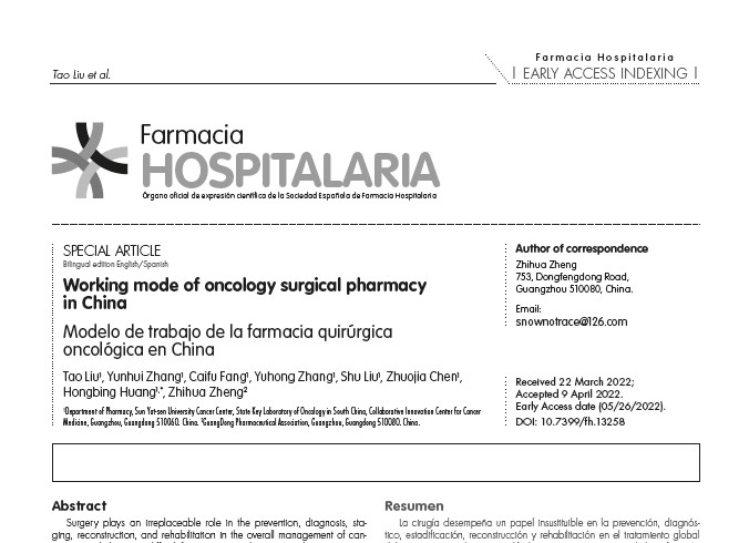 2021年12月,西班牙醫(yī)院藥學(xué)學(xué)會(huì)(Sociedad Espa?ola de Farmacia Hospitalaria,SEFH)官刊——《醫(yī)院藥學(xué)》(Farmacia Hospitalaria)雜志通過國(guó)際藥學(xué)聯(lián)合會(huì)(International Pharmaceutical Federation,F(xiàn)IP)向本會(huì)約稿。2022年5月,由中山大學(xué)腫瘤防治中心劉韜主任團(tuán)隊(duì)撰寫的關(guān)于“外科藥學(xué)”的專論——“中國(guó)腫瘤外科藥學(xué)工作模式”一文在該刊以西班牙文和英文同時(shí)發(fā)表,該文介紹了本會(huì)外科藥師圍繞抗腫瘤、抗感染、麻醉、抗凝、血壓、血糖、營(yíng)養(yǎng)、疼痛管理等開展圍手術(shù)期藥學(xué)服務(wù),提高患者生活質(zhì)量的工作模式,是本會(huì)第一篇以西班牙文發(fā)表的論文,有利于除英語讀者外,“外科藥學(xué)”在西班牙語國(guó)家的傳播。