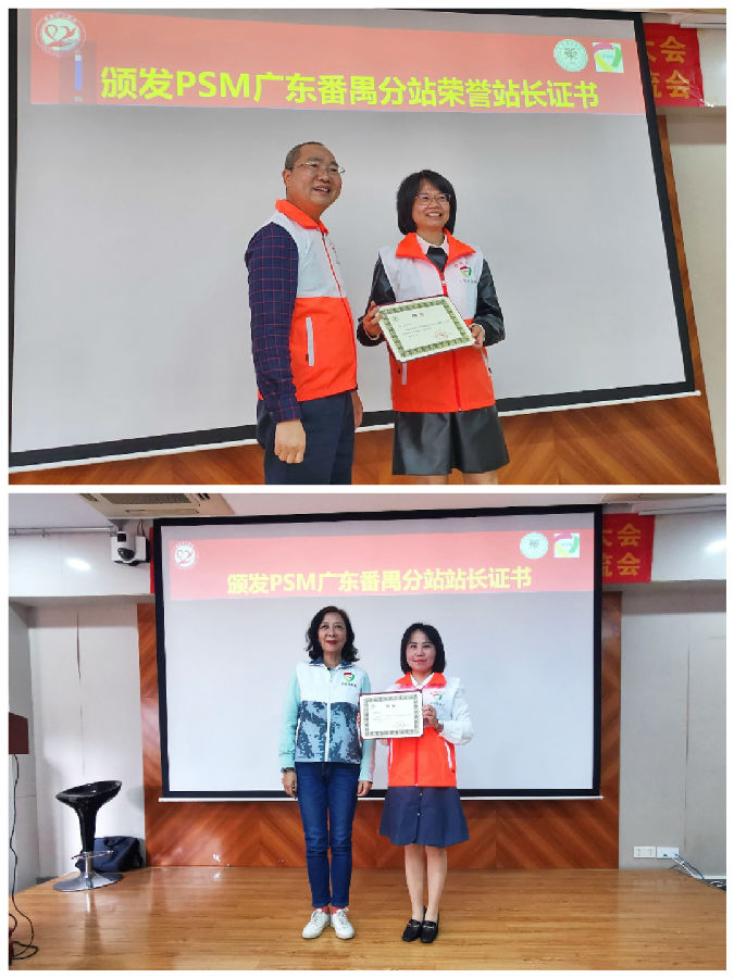 PSM廣東總站站長吳新榮宣布PSM番禺分站正式成立,并向分站站長、番禺區(qū)中心醫(yī)院藥學(xué)部副主任蘇健芬授予旗幟和證書。為肯定番禺區(qū)婦幼保健院林岱主任對番禺分站前期建設(shè)作出的貢獻(xiàn),特聘為番禺分站名譽(yù)站長。