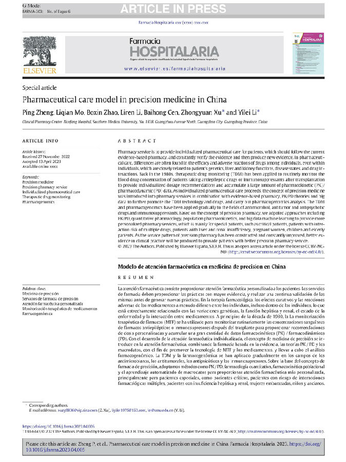 2023年5月27日,由南方醫(yī)科大學(xué)南方醫(yī)院李亦蕾教授團(tuán)隊(duì)完成的“中國個(gè)體化精準(zhǔn)藥學(xué)服務(wù)模式”在西班牙醫(yī)院藥學(xué)學(xué)會(Sociedad Espa?ola de Farmacia Hospitalaria,SEFH)官刊――《醫(yī)院藥學(xué)》(Farmacia Hospitalaria)雜志發(fā)表。該論文為通過國際藥學(xué)聯(lián)合會(International Pharmaceutical Federation,F(xiàn)IP)的專題約稿。全文鏈接:https://authors.elsevier.com/sd/article/S1130-6343(23)00040-5