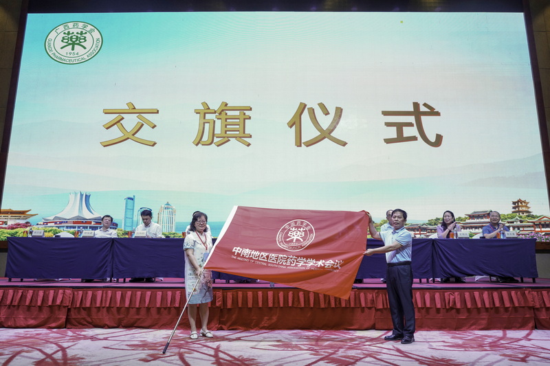 經(jīng)大會討論,《中南地區(qū)第十九屆醫(yī)院藥學(xué)學(xué)術(shù)會議》2024年在海南省舉行,開幕式上舉行了莊嚴(yán)的交旗儀式,由廣西藥學(xué)會秘書長黃瑞松將中南地區(qū)醫(yī)院藥學(xué)學(xué)術(shù)會議會旗交給海南省藥學(xué)會副秘書長韓方璇。