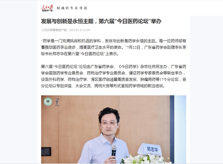 2023年7月22日,由廣東省藥學(xué)會、《今日藥學(xué)》雜志社聯(lián)合主辦,廣東省藥學(xué)會醫(yī)院藥學(xué)專業(yè)委員會、藥物治療學(xué)專業(yè)委員會、藥學(xué)科普專家委員會等聯(lián)合承辦的第六屆今日醫(yī)藥論壇在廣州成功舉辦。