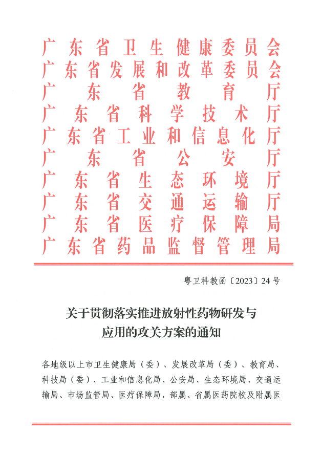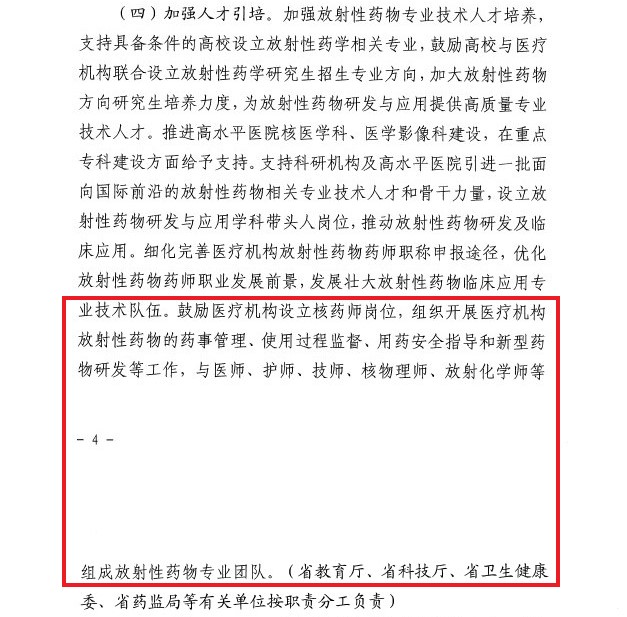 2023年9月4日,廣東省衛(wèi)生健康委員會牽頭10委廳局聯合印發(fā)“關于貫徹落實推進放射性藥物研發(fā)與應用的攻關方案的通知”(粵衛(wèi)科教函〔2023〕24號)中,廣東省藥學會首倡設立核藥師崗位的呼吁被采用,文件提出:“鼓勵醫(yī)療機構設立核藥師崗位,組織開展醫(yī)療機構放射性藥物的藥事管理、使用過程監(jiān)督、用藥安全指導和新型藥物研發(fā)等工作,與醫(yī)師、護師、技師、核物理師、放射化學師等組成放射性藥物專業(yè)團隊。”