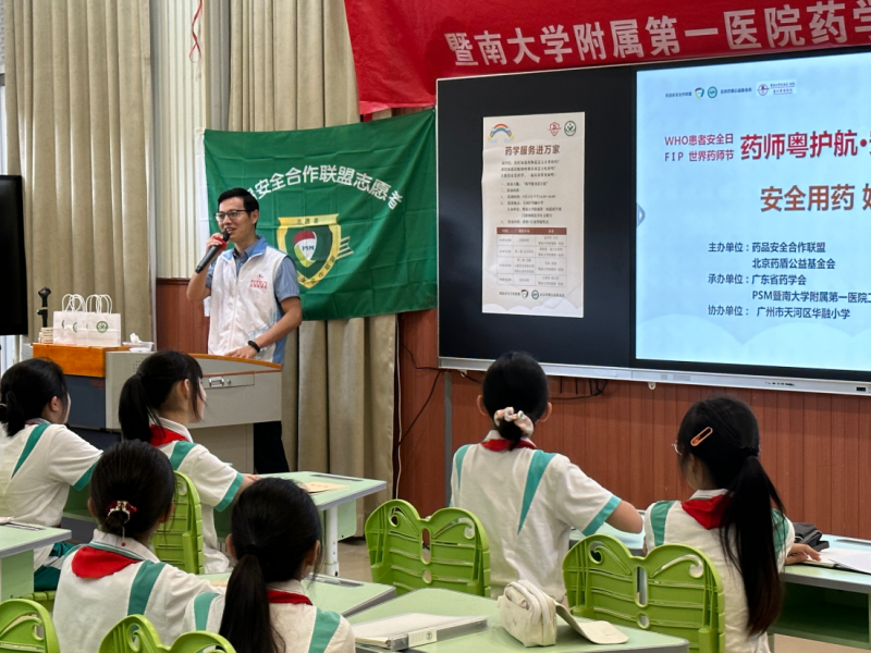 為迎接世界患者安全日和世界藥師節(jié),提升兒童群體安全用藥意識,普及科學(xué)用藥知識,PSM暨南大學(xué)附屬第一醫(yī)院工作站志愿者以安全用藥進(jìn)校園的形式,在天河區(qū)華融小學(xué)開展了“安全用藥,娃娃抓起”公益科普講座活動。華融小學(xué)教導(dǎo)處張宏偉主任攜該校五年級學(xué)生150余人參加活動,本次活動由華融小學(xué)潘莉莉老師主持。