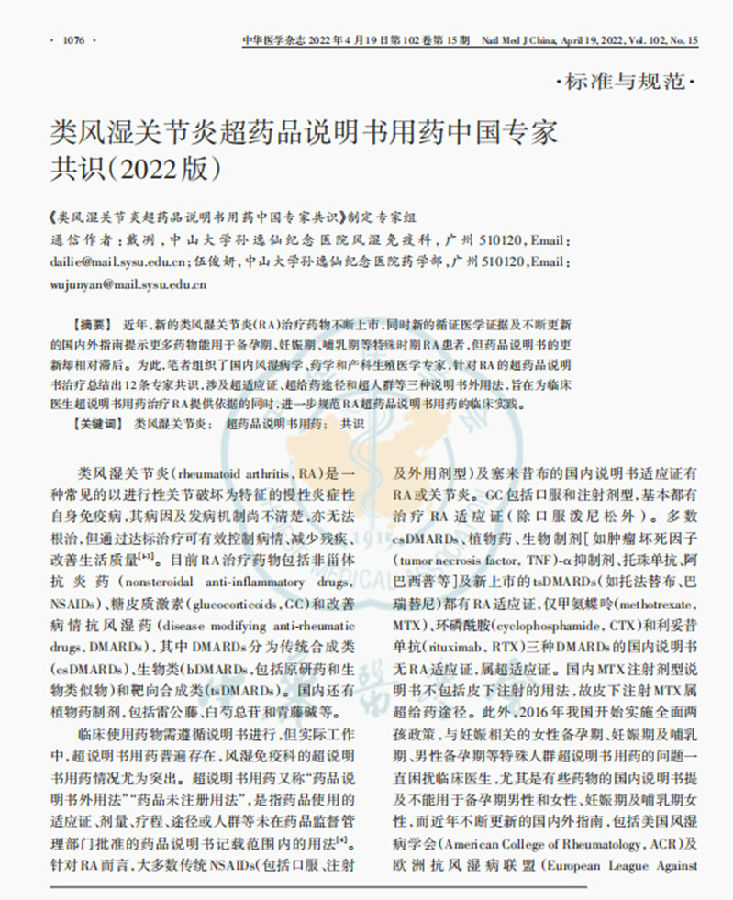 近年,新的類風(fēng)濕關(guān)節(jié)炎(RA)治療藥物不斷上市,同時(shí)新的循證醫(yī)學(xué)證據(jù)及不斷更新的國(guó)內(nèi)外指南提示更多藥物能用于備孕期、妊娠期、哺乳期等特殊時(shí)期 RA患者,但藥品說明書的更新卻相對(duì)滯后。因此,中山大學(xué)孫逸仙紀(jì)念醫(yī)院風(fēng)濕免疫科戴冽主任和藥學(xué)部伍俊妍主任牽頭制訂的《類風(fēng)濕關(guān)節(jié)炎超藥品說明書用藥中國(guó)專家共識(shí)(2022版)》(以下簡(jiǎn)稱本共識(shí)),本共識(shí)的執(zhí)筆專家是中山大學(xué)孫逸仙紀(jì)念醫(yī)院風(fēng)濕免疫科的莫穎倩副主任醫(yī)師和藥學(xué)部的林茵副主任藥師,涉及超適應(yīng)證、超給藥途徑和超人群等三種說明書外用法,旨在為臨床醫(yī)生超說明書用藥治療RA提供依據(jù)的同時(shí),進(jìn)一步規(guī)范RA超藥品說明書用藥的臨床實(shí)踐。(廣東省藥學(xué)會(huì)風(fēng)濕免疫用藥專家委員會(huì)供稿、圖)