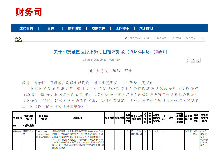 圖1 《全國醫(yī)療服務(wù)項目技術(shù)規(guī)范(2023年版)》將“藥師門診診察”項目列入其中