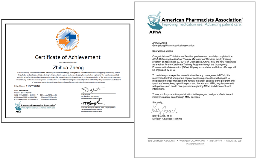 圖4 美國藥師協(xié)會(APhA)藥物治療管理(MTM)培訓(xùn)證書和講師證書