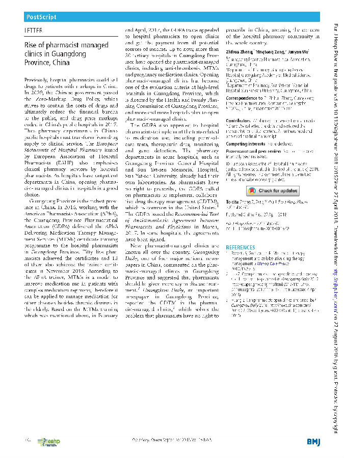 圖10 2018年4月《歐洲醫(yī)院藥學(xué)雜志》(European Journal of Hospital Pharmacy)發(fā)表了廣東藥學(xué)門診建設(shè)成果