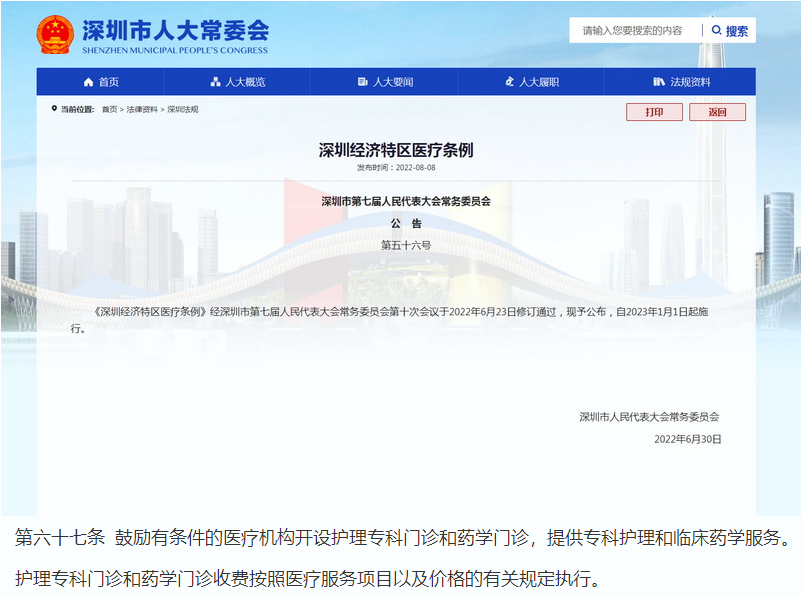 在深圳藥師們的努力下,經(jīng)深圳市第七屆人民代表大會常務(wù)委員會第十次會議于2022年6月23日修訂通過,自2023年1月1日起施行的《深圳經(jīng)濟特區(qū)醫(yī)療條例》將“藥學(xué)門診”寫入第六十七條,標志著“藥學(xué)門診”入法。