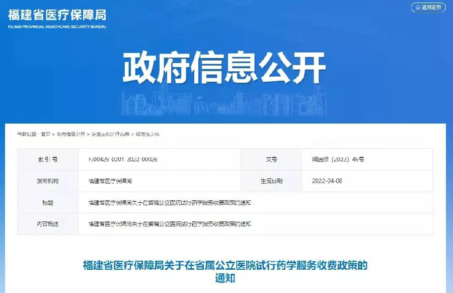2022年4月,福建省醫(yī)療保障局發(fā)布關(guān)于在省屬公立醫(yī)院試行藥學(xué)服務(wù)收費政策的通知,明確了藥物治療門診的收費標準和醫(yī)保屬性,這是我國第一次將藥學(xué)門診收費納入醫(yī)保。
