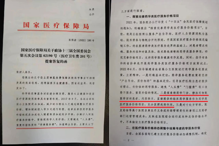 2022年9月,國家醫(yī)療保障局在答復(fù)政協(xié)張喆人委員關(guān)于設(shè)立藥事服務(wù)費保障醫(yī)院藥學(xué)事業(yè)可持續(xù)發(fā)展的提案中指出,探索將藥學(xué)門診、靜脈藥物配置等面向患者、內(nèi)容獨立、直接提供的臨床藥學(xué)服務(wù)作為藥學(xué)類醫(yī)療服務(wù)價格項目,充分發(fā)揮藥師作用。