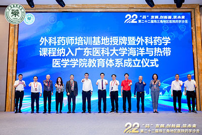 會議期間還舉行了外科藥師培訓(xùn)基地授牌儀式,以及外科藥學(xué)課程納入廣東醫(yī)科大學(xué)海洋與熱帶醫(yī)學(xué)學(xué)院教育體系的成立儀式。
