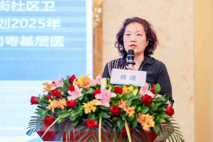 3、廣州醫(yī)科大學(xué)附屬第一醫(yī)院魏理主任代表社區(qū)工作委員會培訓(xùn)基地作報告。魏理主任介紹自社區(qū)工作委員會成立以來培訓(xùn)基地的發(fā)展?fàn)顩r,包括舉辦多期南粵基層醫(yī)藥賦能班,初步構(gòu)建南粵基層醫(yī)藥賦能項目質(zhì)控體系,啟動培訓(xùn)教材的編寫,啟動慢阻肺基層篩查項目,同時培訓(xùn)基地還開展了四屆基層醫(yī)藥技能大賽和首屆基層科普大賽,去年還增加了社區(qū)藥師安全用藥科普演講大賽,還為基層醫(yī)療機(jī)構(gòu)開設(shè)藥物咨詢服務(wù)或藥學(xué)門診提供理論、實踐學(xué)習(xí)和專業(yè)認(rèn)證。魏理主任還為新一年培訓(xùn)基地的工作計劃指明方向。