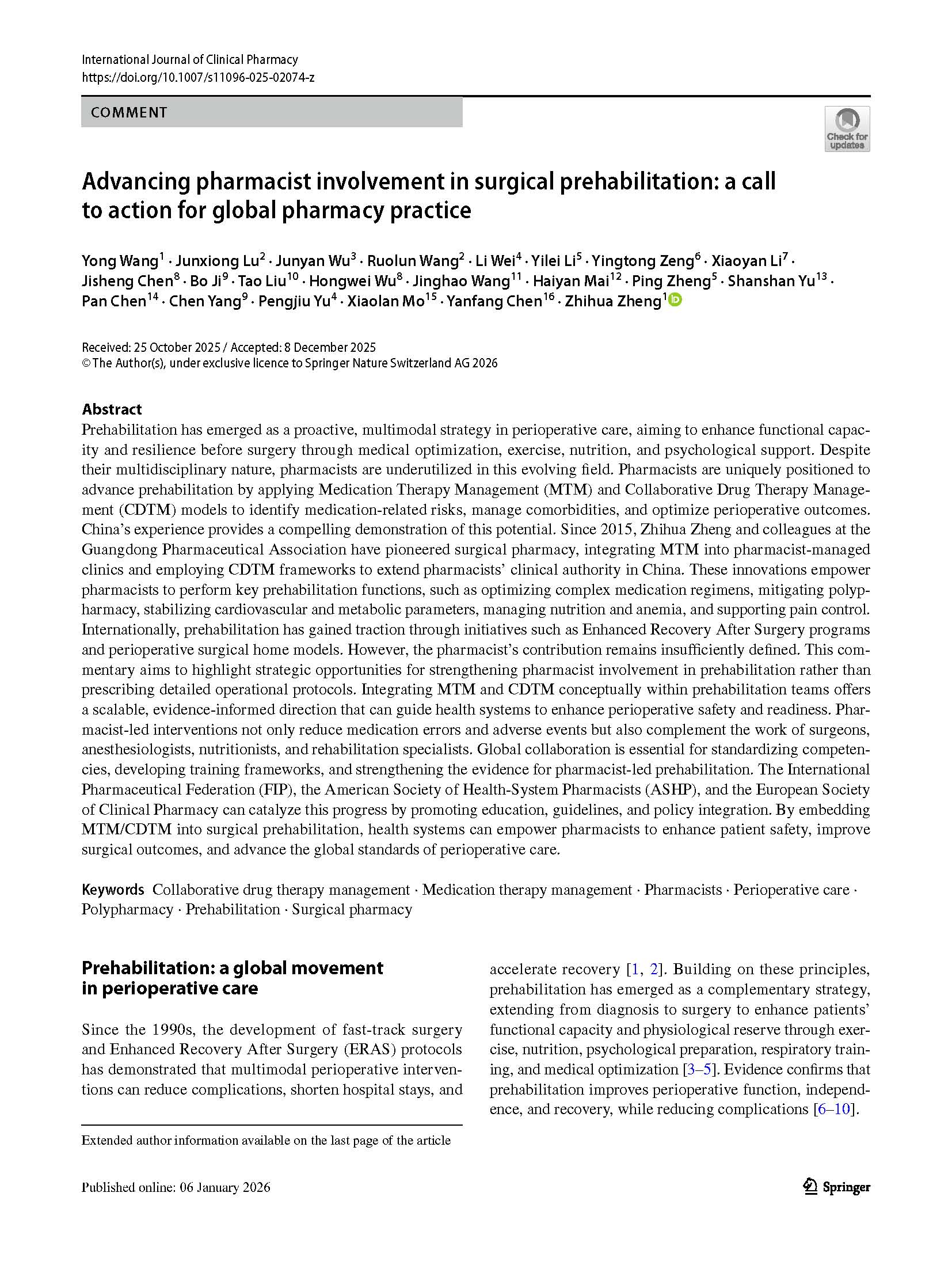 廣東省藥學會2025年9月22日呼吁藥師利用藥物治療管理(MTM)模式開展外科預康復工作(http://m.quintinteriors.com/notification/3416.html),相關專論在《今日藥學》雜志發(fā)表(王勇,盧鈞雄,伍俊妍,等.藥師利用藥物治療管理模式開展外科預康復[J].今日藥學,2025,35(11):806-812.)。2026年1月6日,相關呼吁在《國際臨床藥學雜志》發(fā)表(Wang, Y., Lu, J., Wu, J. et al. Advancing pharmacist involvement in surgical prehabilitation: a call to action for global pharmacy practice. Int J Clin Pharm (2026). https://doi.org/10.1007/s11096-025-02074-z.),鏈接為:https://link.springer.com/article/10.1007/s11096-025-02074-z,摘要為: