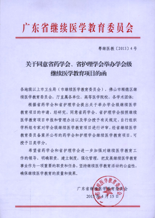 根據(jù)廣東省繼續(xù)醫(yī)學(xué)教育委員會(huì)《關(guān)于同意省藥學(xué)會(huì)、省護(hù)理學(xué)會(huì)舉辦學(xué)會(huì)級繼續(xù)醫(yī)學(xué)教育項(xiàng)目的函》(粵繼醫(yī)教[2013]4號)的批復(fù),本會(huì)獲得授予繼續(xù)醫(yī)學(xué)教育項(xiàng)目Ⅱ類學(xué)分資格。