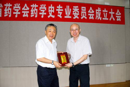 王寧生理事長為藥學史專業(yè)委員會主任委員梅全喜教授頒發(fā)聘書