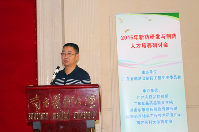 由廣東省藥學會第十七屆理事會制藥工程專業(yè)委員會主辦,廣州市藥品檢驗所、廣東食品藥品職業(yè)學院、湖南爾康制藥股份有限公司、國家藥用輔料工程技術研究中心和南方醫(yī)科大學藥學院共同承辦的“新藥研發(fā)與制藥人才培養(yǎng)研討會”在南方醫(yī)科大學楓林堂如期舉行。南方醫(yī)科大學高天明副校長出席大會開幕式并致辭,本會制藥工程專業(yè)委員會王霆主任委員宣布大會開幕。會議由南方醫(yī)科大學藥學院賈志敏副院長、廣州市藥品檢驗所、國家藥典委員張玉英主任主持。