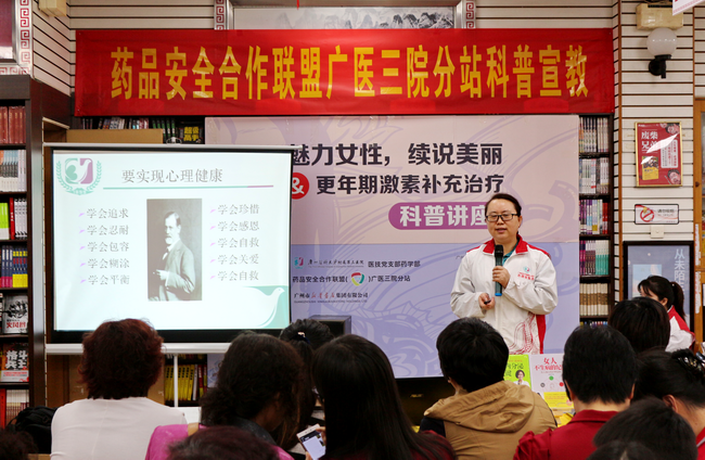 2016年3月6日下午,為慶祝“三八”國際婦女節(jié),關(guān)愛女性健康,廣州醫(yī)科大學(xué)附屬第三醫(yī)院醫(yī)技黨支部、團支部、藥品安全合作聯(lián)盟(PSM)廣醫(yī)三院分站聯(lián)合新華書店(北京路店)舉辦了一場“魅力女性,續(xù)說美麗——更年期激素補充治療”為主題的科普講座和咨詢活動。藥學(xué)部司徒冰主任藥師、婦產(chǎn)科王芳教授應(yīng)邀作專題講座。