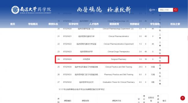 南昌大學(xué)藥學(xué)院將外科藥學(xué)作為臨床藥學(xué)專業(yè)的專業(yè)核心課(必修)