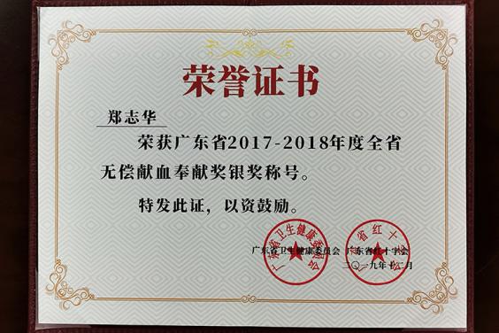 生命不息、獻血不止--廣東省藥學會鄭志華秘書長榮獲全省無償獻血奉獻銀獎光榮稱號