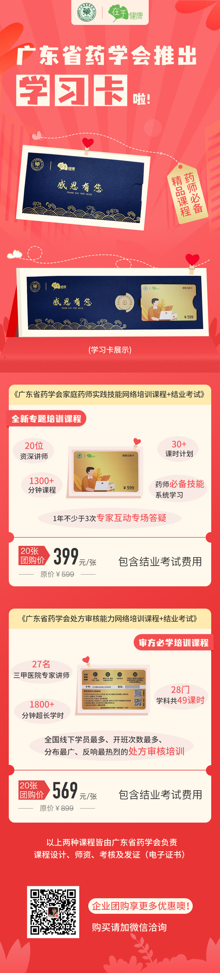 廣東省藥學(xué)會(huì)隆重推出學(xué)習(xí)卡!《審方網(wǎng)課》、《家庭藥師網(wǎng)課》,兩個(gè)精品課程,藥師必備!有意向可掃海報(bào)二維碼咨詢,團(tuán)購有優(yōu)惠哦!
