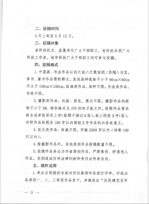 為慶祝中國(guó)共產(chǎn)黨成立100周年,省科協(xié)決定開(kāi)展“永遠(yuǎn)跟黨走,奮進(jìn)新征程”優(yōu)秀征文、攝影、書(shū)法和繪畫(huà)等作品征集展陳活動(dòng)。
