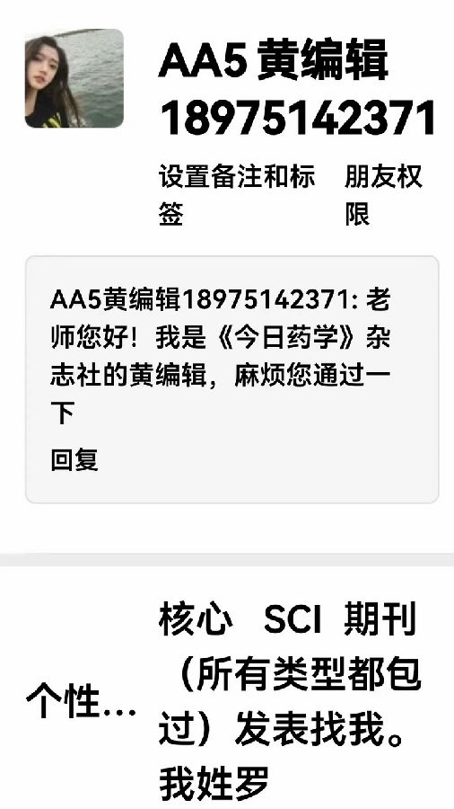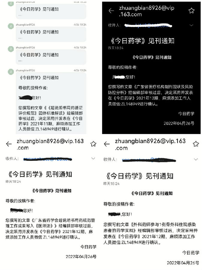 近日,已有多人反映,有人以郵件通知形式(假冒郵箱:zhuangbian8926@vip.163.com)或要求添加微信方式(假冒用微信號(hào):AA5黃編輯18975142371、zzwm1487、ZL148949)冒稱《今日藥學(xué)》雜志編輯部工作人員,聲稱論文已通過編輯部審核決定采用并發(fā)表,要求作者添加其個(gè)人微信,伺機(jī)套取作者信息、實(shí)施行騙或進(jìn)行其他不法行為。為此,本刊特聲明如下: