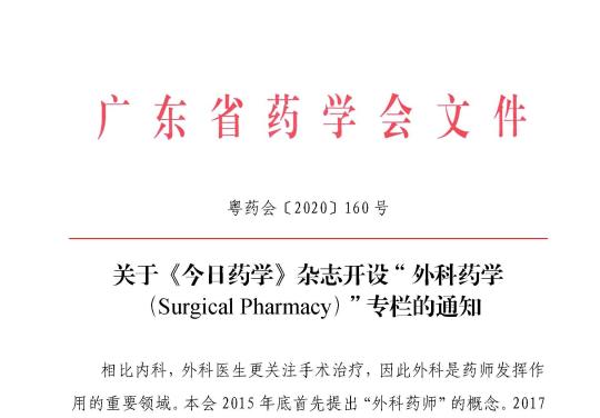 關(guān)于《今日藥學》雜志開設(shè)“外科藥學(Surgical Pharmacy)”專欄的通知